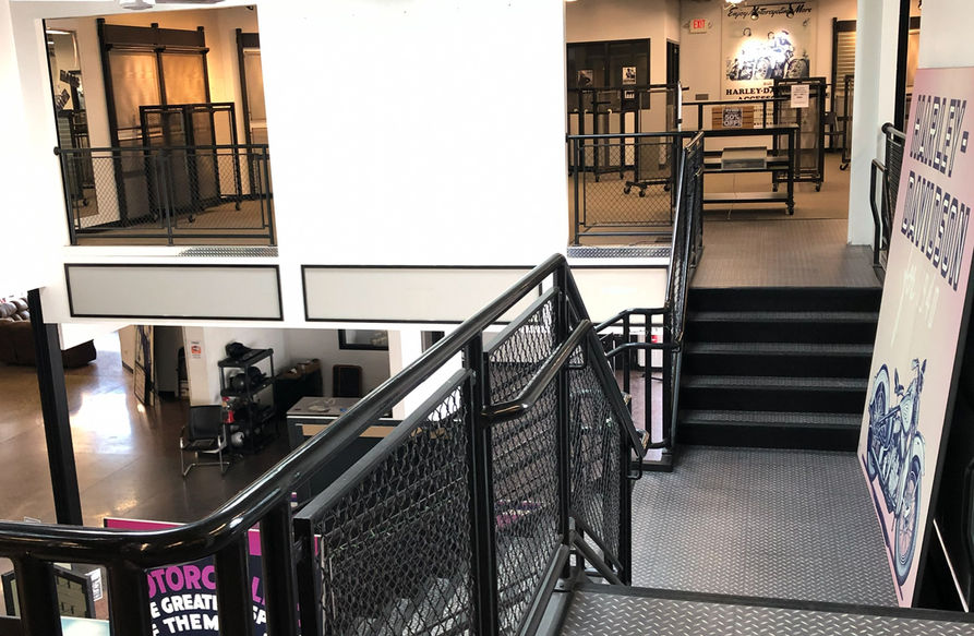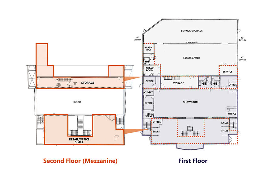 The showroom consists of open, clear-span space with strong ceiling heights and integrated mezzanine areas suitable for additional display, office, or storage. The service/warehouse component includes open work areas, parts storage mezzanine, and functional access points to accommodate equipment-based operations and service-oriented users.