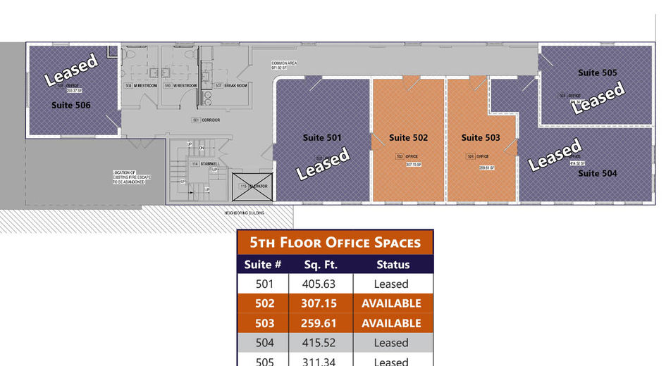 The 5th floor is available for lease as single-room offices, with the option to combine multiple offices. It boasts high ceilings, large windows that provide ample natural light, and breathtaking penthouse views of Continental Square. Leases cover all expenses, including WiFi, and the use of a shared kitchenette/breakroom and restrooms.