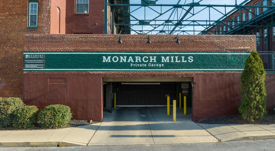 Monarch Mills Condominiums offer a secure, covered parking garage on the lower level and a central shared courtyard with ponds, community grills, outdoor seating, and planters.
